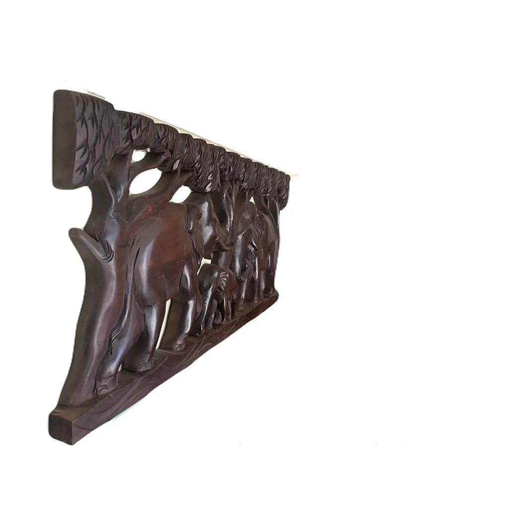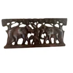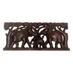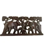 This handcrafted wooden wall hanging features a family of elephants walking beneath a lush canopy of trees. The intricate carving, highlighted by the natural wood grain and dark polished finish, adds rustic charm and symbolizes strength, wisdom, and family bonding.