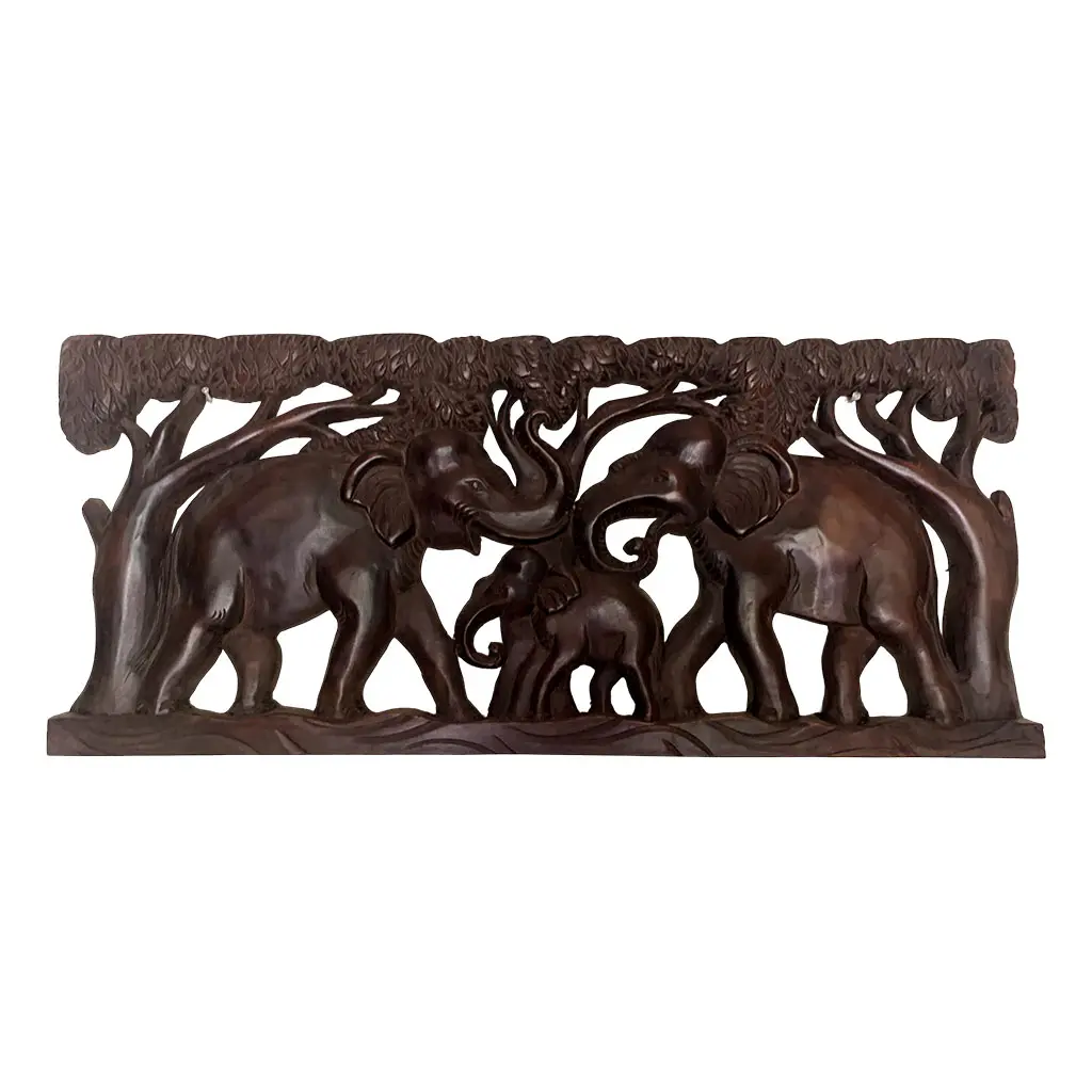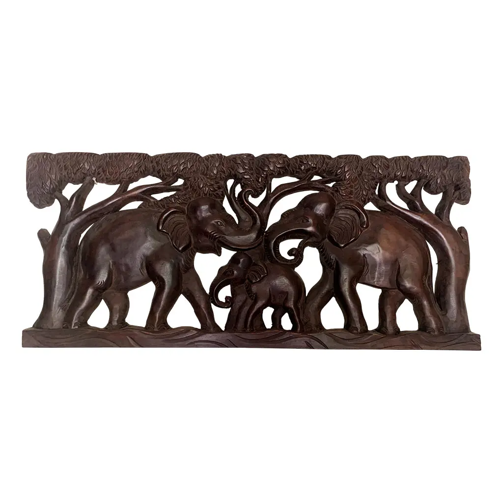 📌 Depicts a family of elephants in a natural forest setting with intricate wood carvings