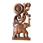 This handcrafted wooden wall hanging features a family of elephants walking beneath a lush canopy of trees. The intricate carving, highlighted by the natural wood grain and dark polished finish, adds rustic charm and symbolizes strength, wisdom, and family bonding.